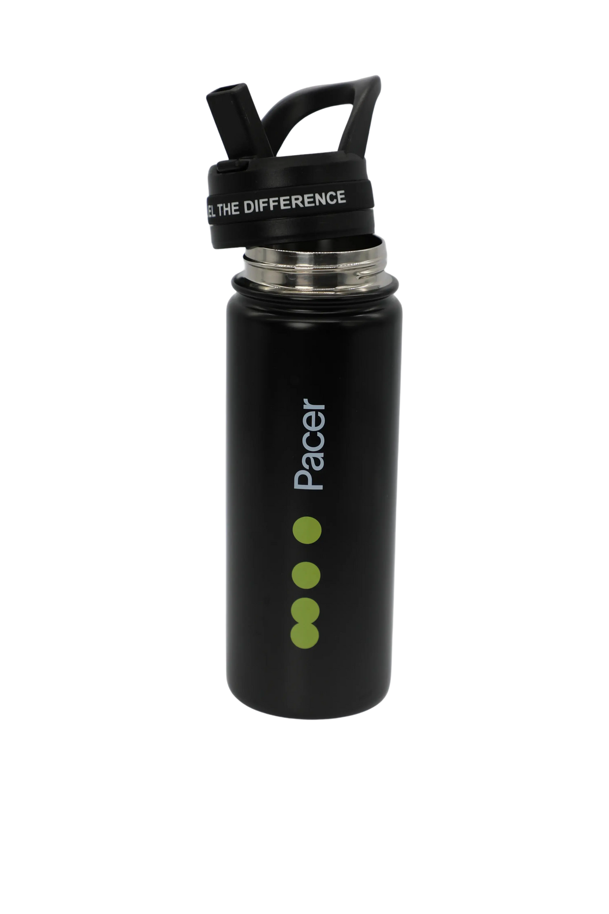 Zwarte PACER Flow thermofles 550 ml met ingebouwd rietje en slogan ‘Fuel The Difference’ op de dop