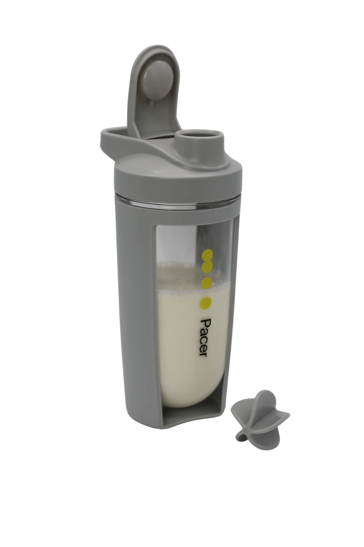 Grijze PACER shaker met PACER-logo, gevuld met shake – dop open en mengprop zichtbaar
